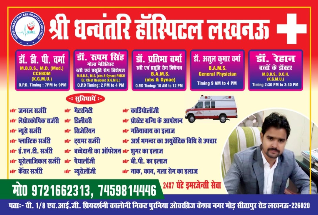 Shri Dhanvantari Hospital, Lucknow is a trusted multi-specialty healthcare center providing quality medical services by experienced and qualified doctors. The hospital offers treatment in General Medicine, General & Laparoscopic Surgery, Gynecology & Obstetrics, Pediatrics, Orthopedics, Urology, Neurology, Gastroenterology, Cardiology, and Ayurvedic care. Facilities include OPD services, safe deliveries, minor and major surgeries, modern diagnostic support, and 24×7 ambulance service. We are committed to compassionate care, accurate diagnosis, and affordable treatment for all patients. Conveniently located on Sitapur Road, Lucknow, ensuring easy accessibility.